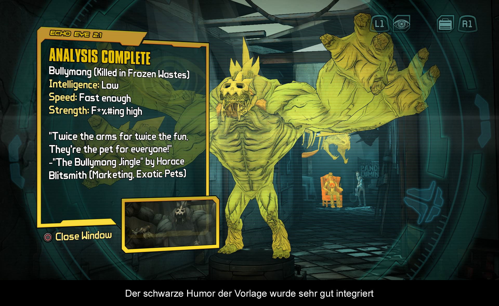 Bei der Spielmechanik bleibt man der üblichen Telltale Formel gleich. Man steuert den Helden durch eine Umgebung und sucht alles nach brauchbaren Objekten ab. Trifft man auf einen Handlungscharakter beginnen die Dialogoptionen. Man hat eine bestimmte Zeit um zu antworten. Die Antworten wirken sich auf das Verhalten der Figuren aus und führen möglicherweise zu mehreren Optionen. Für den Action Teil gibt es wieder bekannte Quickt Time Events. Erweitert wird das System mit „Borderlands“ typischen Elementen. So verfügt Ryse über die Möglichkeit, verschiedene Objekte zu scannen und bekommt so manch witzige Information über die Spielewelt. Mehr in Richtung Original geht aber das einmalige Bestücken des Loaders. Kurz darf man eine Ego-Shooter Sequenz steuern, die aber zu schnell vorbei ist. Auch darf man mit Fiona Geld einsammeln. Unglücklicherweise ist keine dieser neuen Optionen wirklich bahnbrechend und sie sollen nur daran erinnern, welche Spielereihe hier Pate stand. Man kann nur hoffen, dass sich das in späteren Episoden ändert.