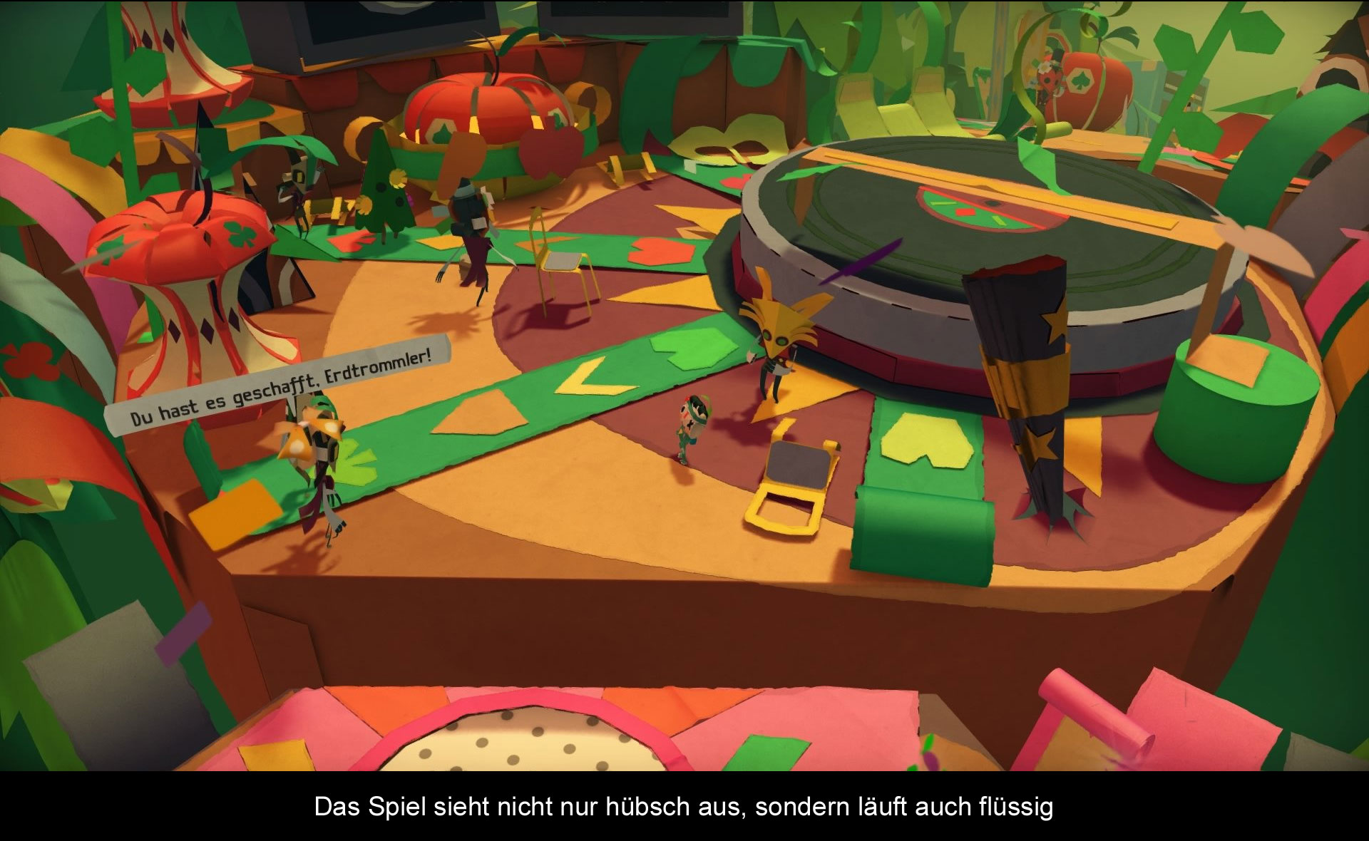 In Tearaway: Unfolded dreht sich alles um Iota bzw. Atoi, eine zum Leben erwachte Nachricht, die man nun zum „Wesen“ bringen muss, was sich am Himmel als Sonne tarnt. Dabei durchlebt man zahlreiche Abenteuer mit dem kleinen Iota, denn der Weg ist natürlich kein leichter. Die Schnipsel haben sich nämlich zum Ziel gesetzt die bunte Welt mit öden Zeitungsausschnitten zu überschatten und die Kontrolle an sich zu reißen. Das Zurückschlagen der Schnipsel gehört also ebenfalls zu euren Aufgaben und während des Abenteuers trefft ihr auf Eichhörnchenkönige, Schweine, Wendiges und allerlei andere Figuren. Die Geschichte ist sehr niedlich erzählt und bietet gute 10 Stunden Spielspaß.