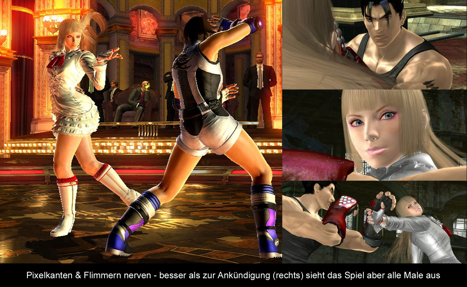 Bislang war die Tekken Serie immer ein Garant für hübsche Grafiken und zu ihrer Zeit sehr feine Animationen. Ganz bestätigen kann man diesen Eindruck aber nicht mehr. Zwar wirkt alles auf den ersten Blick wirklich hübsch und detailliert, doch das ist nur aus der Nähe der Fall und auch nur bei den Charakteren. Sobald man den Charakter nicht in einer Zwischensequenz sieht, sondern aus einem gewissen Abstand, macht sich das Aliasing bemerkbar, was den Gesamteindruck ein wenig stört. Zudem wirken vor allem im Kampagnenmodus die Level äußerst unkreativ und sind dann auch noch mit schwachen Texturen ausgestattet. Hier hätte man eigentlich mehr erwartet, vor allem nach dem Ankündigungsvideo, in dem man jede Pore von Jin sehen konnte. Das dies nicht möglich ist, war zwar klar, aber trotzdem ist der Gesamteindruck eher bescheiden ausgefallen, da Sachen wie das Aliasing oder Kantenflimmern in manchen Szenen äußerst stören. Dafür verdienen die Animationen aber ein großes Lob, da die Kämpfe so flüssig ablaufen, wie noch nie zuvor. Jeder Angriff geht in den anderen hinüber und es sieht einfach fantastisch aus. Da hat man sich wirklich Mühe gegeben. Zumindest mehr als bei der allgemeinen technischen Umsetzung, denn wenn man das Spiel nicht auf der Festplatte installiert, werden die Ladezeiten einen in den Wahnsinn treiben. Diese sind viel zu lang und kommen auch viel zu häufig vor. Ein Beispiel gefällig? Bitte: Man startet das Spiel, klickt das Intro weg und es wird erstmal etwa eine halbe Minute geladen. Dann sieht man endlich das Menü, aber das Logo verrät einem, dass im Hintergrund immer noch geladen wird. Aber wie man so ist, will man schnell weiter und klickt den Kampagnen-Modus an. Hier wird erstmal die Charakter-Auswahl geladen und wenn man dann einen Kämpfer ausgewählt hat, dauert es wieder etwas. Und wenn man dann sein Level ausgewählt hat, muss man wieder eine Ladezeit überwinden. Aber wehe dem, der im Level stirbt und es Neustarten oder seinen Charakter neu ausstatten möchte. Zudem wird es wohl ein Rätsel bleiben, warum bei Spielstart die Trophäen immer wieder neu installiert werden müssen. Hohe Programmierkunst sieht jedenfalls ganz anders aus!