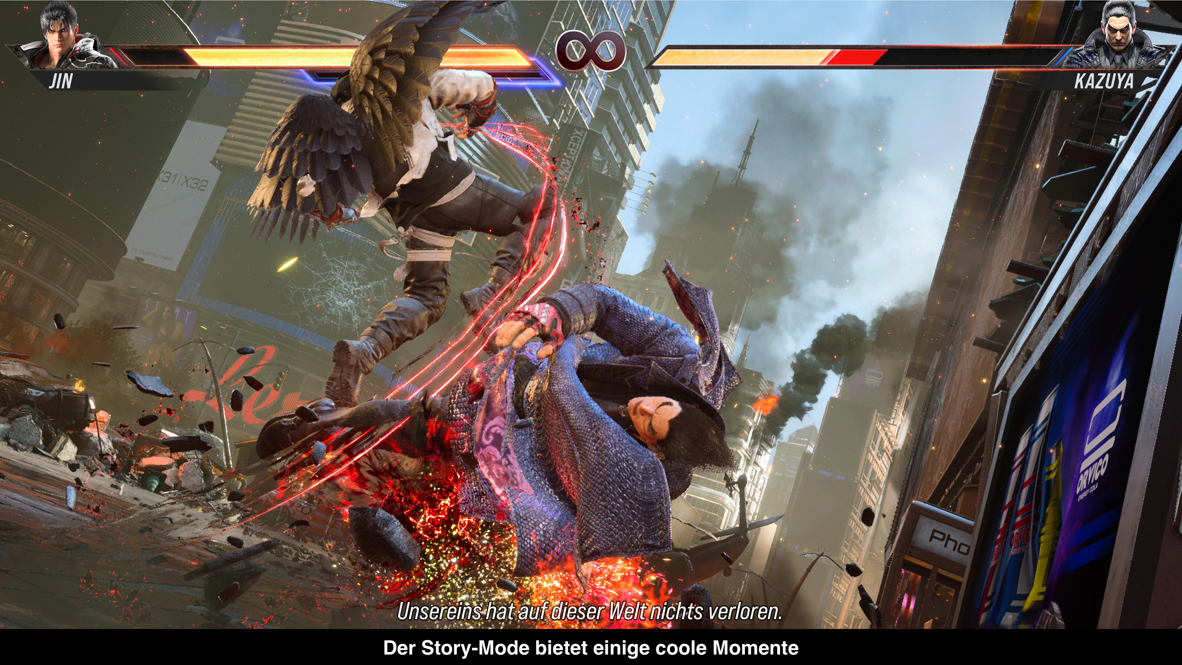 Nachdem Kazuya in Tekken 7 Heihachi endgültig getötet hat, ist er der mächtigste Mann der Welt und leidet auch noch unter Größenwahn. Denn laut Kazuya ist die Welt zu schwach und das Problem möchte er mit dem nächsten King of Iron Fist Tournament lösen. Nur die Stärksten sollen überleben und die Verlierer und ihre Nationen werden von Kazuya persönlich ausgelöscht. Natürlich gibt es breiten Widerstand gegen Kazuya, aber dank Teufelsgen ist er unheimlich mächtig geworden. Die einzige Hoffnung der Menschheit ist Jin, der auch über das Teufelsgen verfügt und versucht seine vergangenen Taten (dritten Weltkrieg lostreten) wiedergutzumachen. Sein Ziel ist nichts Geringeres als die komplette Auslöschung des Teufelsgens. Letztlich läuft alles auf den großen Showdown zwischen Kazuya und Jin hinaus. Auf dem Weg dahin gibt es aber zahlreiche Wendungen, interessante Storyfetzen und einige bemerkenswerte Momente. Es ist die bisher beste Geschichte in einem Tekken Spiel, aber die Messlatte liegt auch nicht sehr hoch. Dementsprechend sollte niemand tiefgründige Gespräche oder ernste Themen erwarten. Letztlich geht es um ein Turnier von Kämpfern, die das Schicksal der Welt zwischen sich entscheiden.