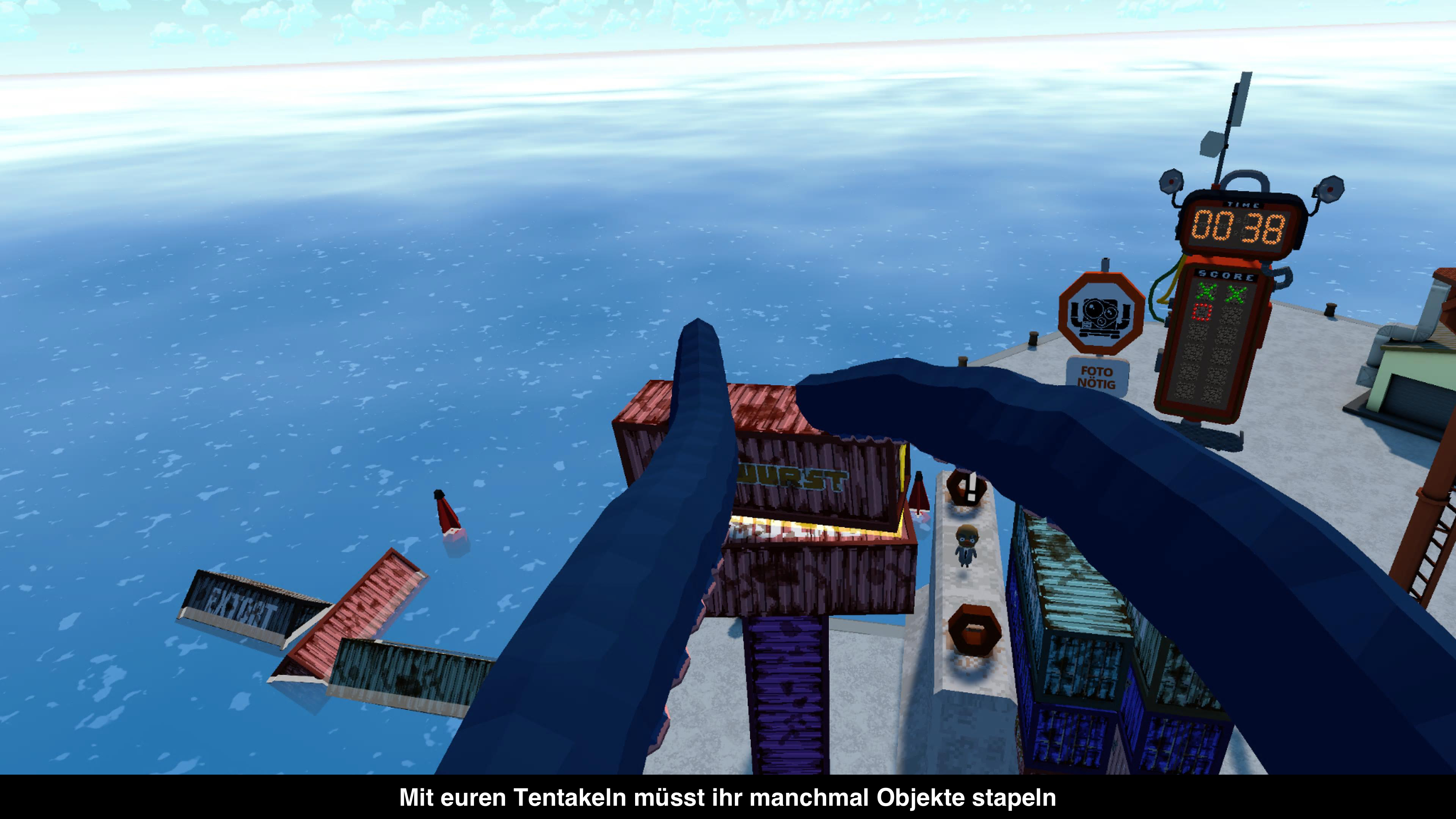 In Tentacular schlüpft ihr in die Rolle eines freundlichen Tentakelmonsters, welches ein Teil der Stadt La Karma ist und dort mit den Bewohnern allerlei Aufgaben erledigt. La Karma besteht dabei aus zahlreichen Inseln und mit euren Tentakelarmen geht es nun darum, den Inselbewohnern zu helfen, indem man z.B. eine Müllhalde aufräumt oder kleine Strukturen aus Containern und anderen Dingen baut. Diese könnt ihr mit euren Armen greifen und dann etwas unkontrolliert ablegen. Zudem könnt ihr euch mit dem linken Analogstick auch um die Insel herum bewegen, was zumindest bei mir für einiges an Motion Sickness geführt hat. Eine Möglichkeit zum Teleportieren wäre schön gewesen. Ansonsten ist das Ganze in eine kleine Geschichte eingewoben. Das ist nett gemeint, aber die Erzählungen der Bewohner sind schnell sehr nervig und es ist nicht immer ganz klar, was von einem erwartet wird. Es gibt auch noch eine Art Sandboxmodus, in dem man eine Insel ganz nach seinem eigenen Willen gestalten kann durch das Bauen von eigenen Strukturen.