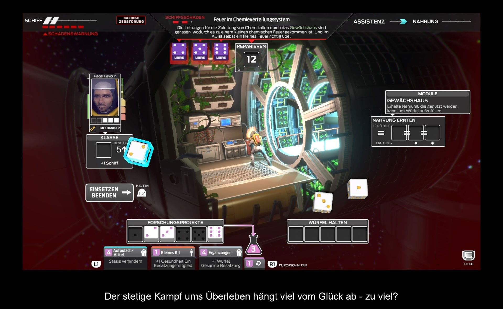 Hat man diese Probleme gemeistert, gibt es noch die schrumpfende Anzahl an Würfeln. Ein Würfel zählt als eine Nahrungseinheit, welcher bei jeder Runde um einen Punkt reduziert wird. Auffrischen kann man diese nur, wenn man Weitere im Gewächshaus erspielt. Sollte dies nicht möglich sein, kann man sich als Kannibale versuchen und verspeist einen Kameraden aus der Crew. Wie man es auch immer schafft, die Runde zu überstehen, am Anfang der Nächsten steht man erneut vor der Frage, ob man seinem Glück vertrauen kann. Nur ein schlechter Wurf – und alle erspielten Vorteile sind weg.
