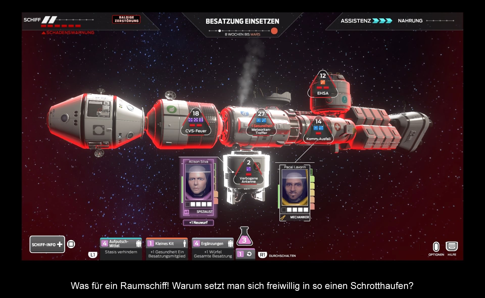 Dennoch, dadurch dass die Runden sehr kurz sind, ist man bereit, gleich von vorne zu starten und was Neues zu versuchen. Vielleicht klappt es doch mit einer anderen Taktik. Gerade kleine Erfolgserlebnisse lassen einen dranbleiben, denn nichts ist befriedigender, als wenn man den perfekten Wurf hat. Unglücklicherweise sind diese Momente in der Minderheit. Man wird bewusst auf dem Weg geführt, in dem man bereit sein muss, etwas zu opfern. Immer mehr Ereignisse treten auf, Negativeffekte sind höher und die Crew trifft schlechte Entscheidungen. Auf was verzichtet man in diesen Situationen? Ignoriert man Schaden und hofft diesen in der nächsten Runde zu beheben? Oder opfert man einen Astronauten, um mehr Würfel zu generieren? Entscheidungen, die jede Runde spannend machen, aber auch frustrierend.