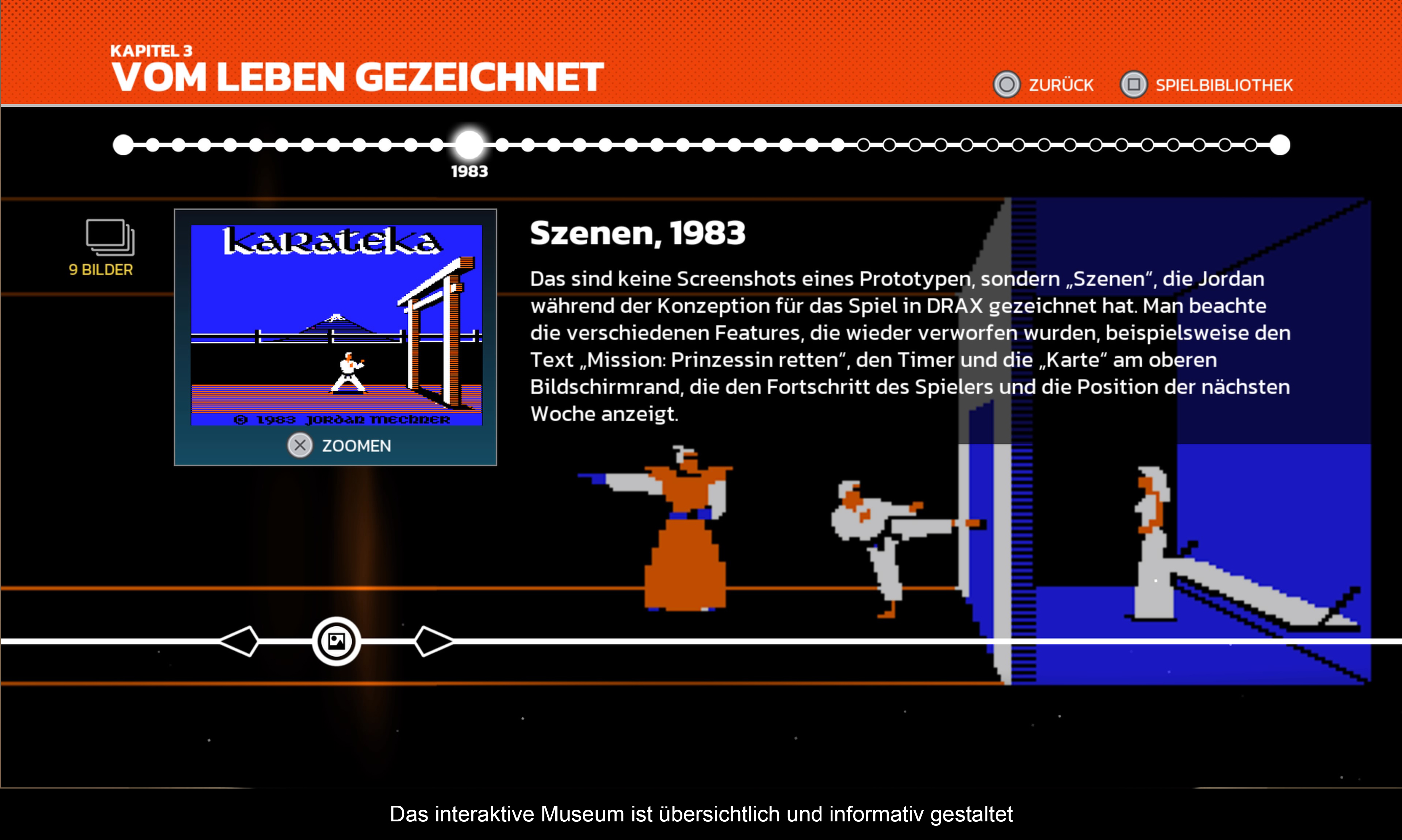 Der ganze Entstehungsprozess von „Karateka“ ist in fünf große Kapitel unterteilt, die grafisch liebevoll aufbereitet wurden. Kurze Texte werden mit Bildern und Musik begleitet, Videos von Zeitzeugen und anderen bekannten Designern sorgen für Kontext. Man darf die Kapitel frei erkunden, ohne jeglichen Zwang und ohne strikte Reihenfolge. Die Bedienung ist dabei kinderleicht und alle Texte (und Untertitel bei den Videos) wurden in deutscher Sprache lokalisiert. Somit fällt es leicht, sich in der Geschichte zu verlieren. Wie war das damals? Welche Inspiration hatte Mechner? Wie viele andere Menschen hat er damit beeinflusst. Aber auch zur Technologie wird Stellung bezogen: Was ist Rotoskopie? Wie lief das mit dem Publisher „Broderbund ab? Briefe, Tagebucheinträge und allerlei Designdokumente verleihen dem Ganzen eine unheimliche Tiefe. Es macht einfach Spaß, in dieses interaktive Museum einzutauchen und die Geschichte hinter „Karateka“ zu erleben.