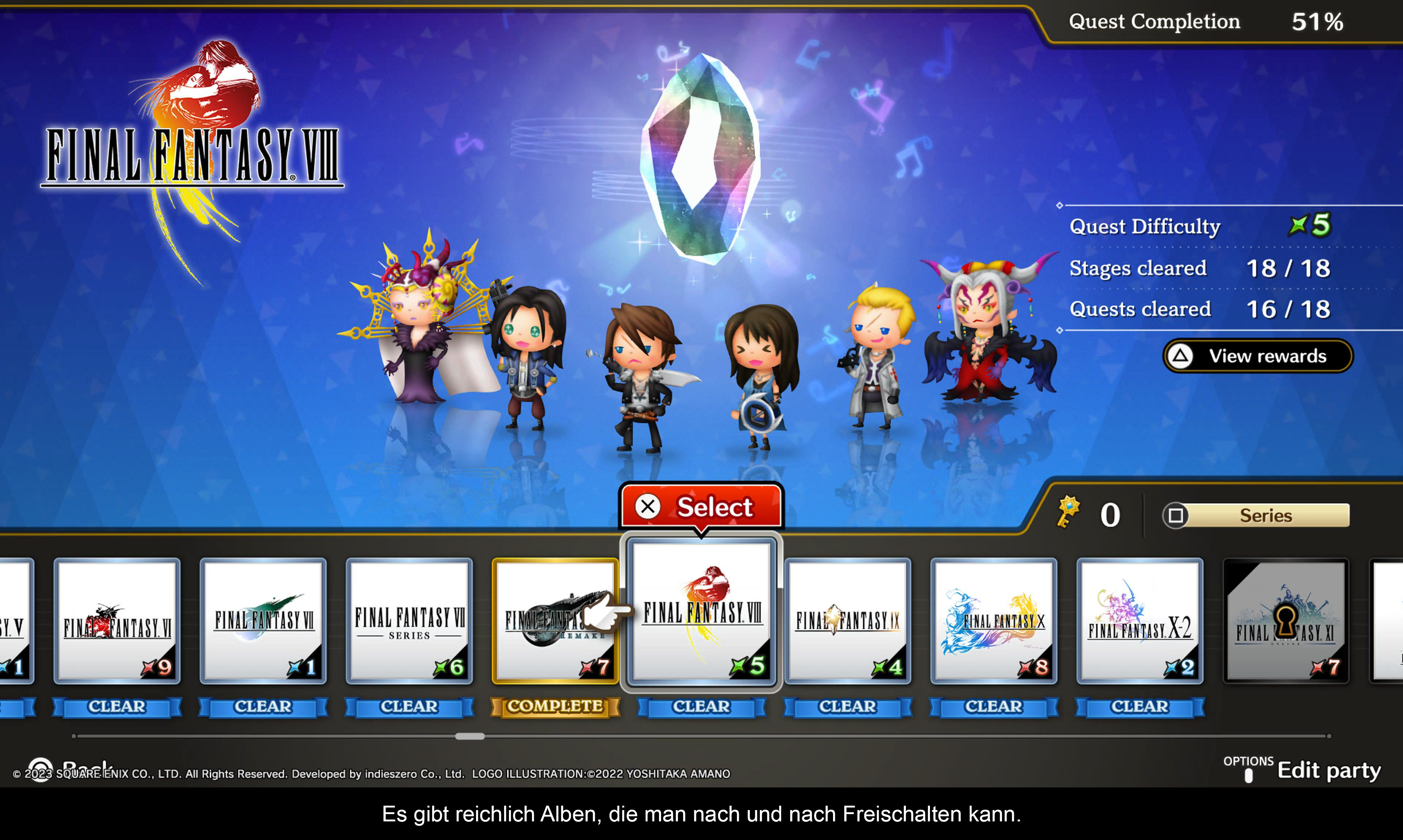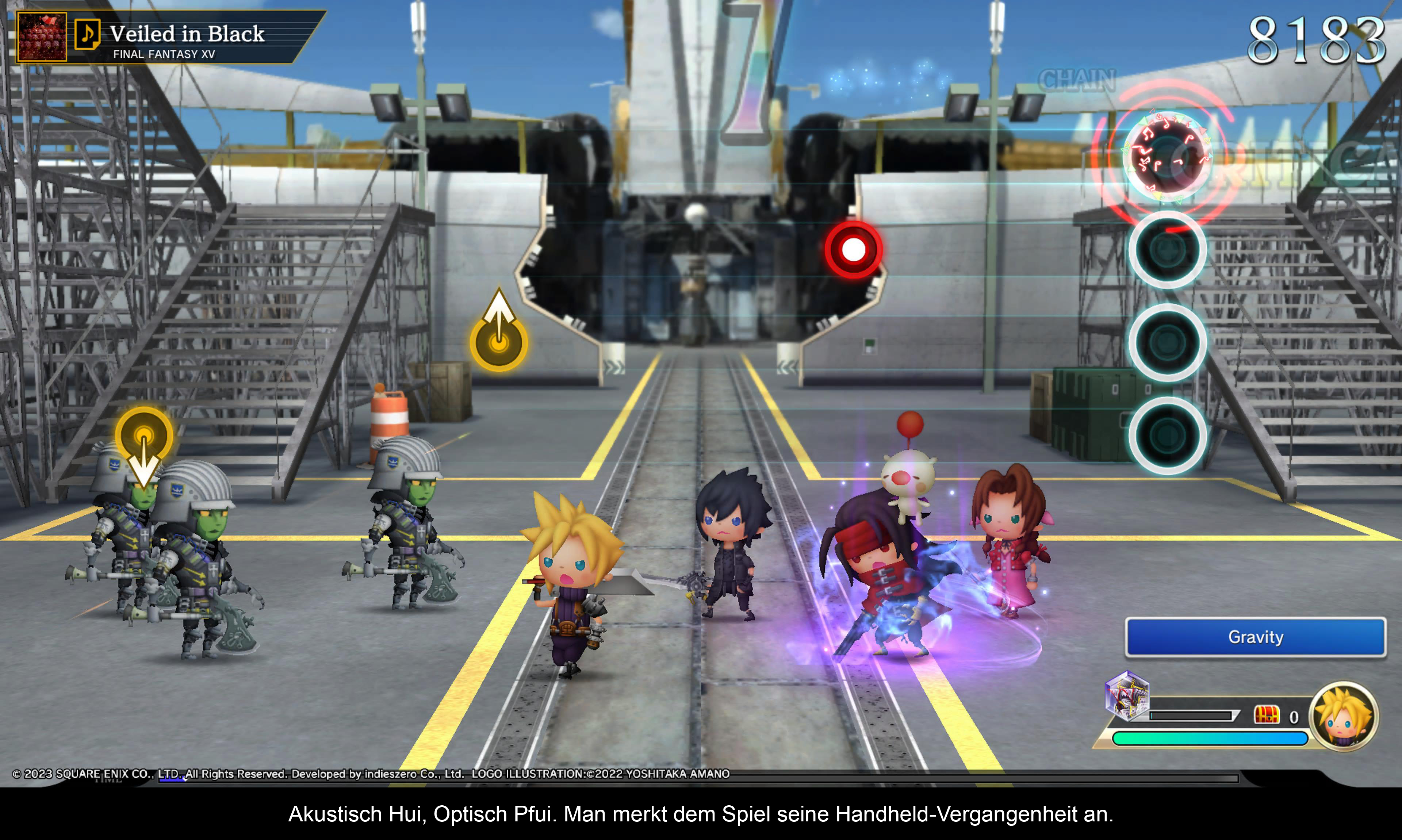Der Sound ist im Grunde über alle Zweifel erhaben. Die Songs sind vielfältig und klingen fantastisch. Abstriche in der B-Note gibts hingegen bei der zweifelhaften Entscheidung, einige Lieder - zum Beispiel Fan-Favorit Dancing Mad von Final Fantasy VI - etwas zu kurz geschnitten zu haben. Andersherum hat man dann drei, vier Versionen von One Winged Angel, was für den ein oder anderen, der Final Fantasy VII vielleicht nicht als das Höchste aller Gefühle betrachtet, eventuell etwas zu viel ist. Dennoch hat mich der akustische Aspekt des Spiels voll und ganz überzeugt. Einen faden Beigeschmack hinterließ jedoch die optische Seite des Spiels. Während die Chibi-ähnlichen Charaktermodelle der Helden und Bosse eigentlich ganz gut aussehen, sind es vor allem die unspektakulären und zum Teil sehr niedrig aufgelösten Hintergründe, die sehr zu Wünschen übrig lassen. Und auch die Ladezeiten sind zum Teil etwas zu lang, was natürlich daran liegt, dass es sich hierbei um ein reines PS4 Spiel handelt, welches nicht von der schnellen Festplatte der PS5 Gebrauch machen kann.