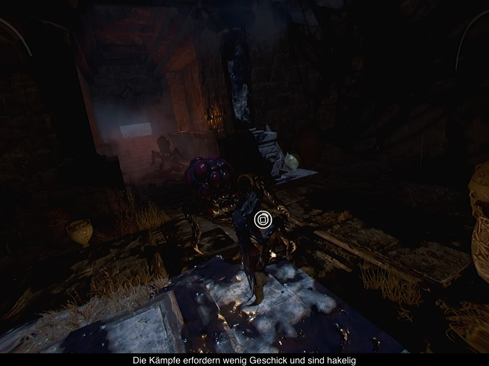 Einzig die Szenen mit dem Minotauros und anderen Gegnern sind etwas interaktiver. Vor dem Minotauros müsst ihr euch natürlich verstecken und z.B. eure Fackel löschen, da er euch ansonsten sieht und mit einem Hieb umbringen kann. Bei Gegnern kann die Fackel ebenfalls eingesetzt werden, denn damit könnt ihr die Gegner erschrecken und zurückweichen lassen, um euch etwas Luft zu verschaffen. Mit etwas Geschick steckt ihr sie in Brand und könnt sie dann mit einem gezielten Schwerthieb besiegen. Leider kommt das Kampfsystem, wie die komplette Steuerung etwas hakelig daher, aber immerhin kann man kaum im Kampf sterben. Dafür sind sonstige Abschnitte leider oft Trial & Error, weil man nicht wirklich weiß, was getan werden soll. Immerhin sind die Checkpoints fair gesetzt