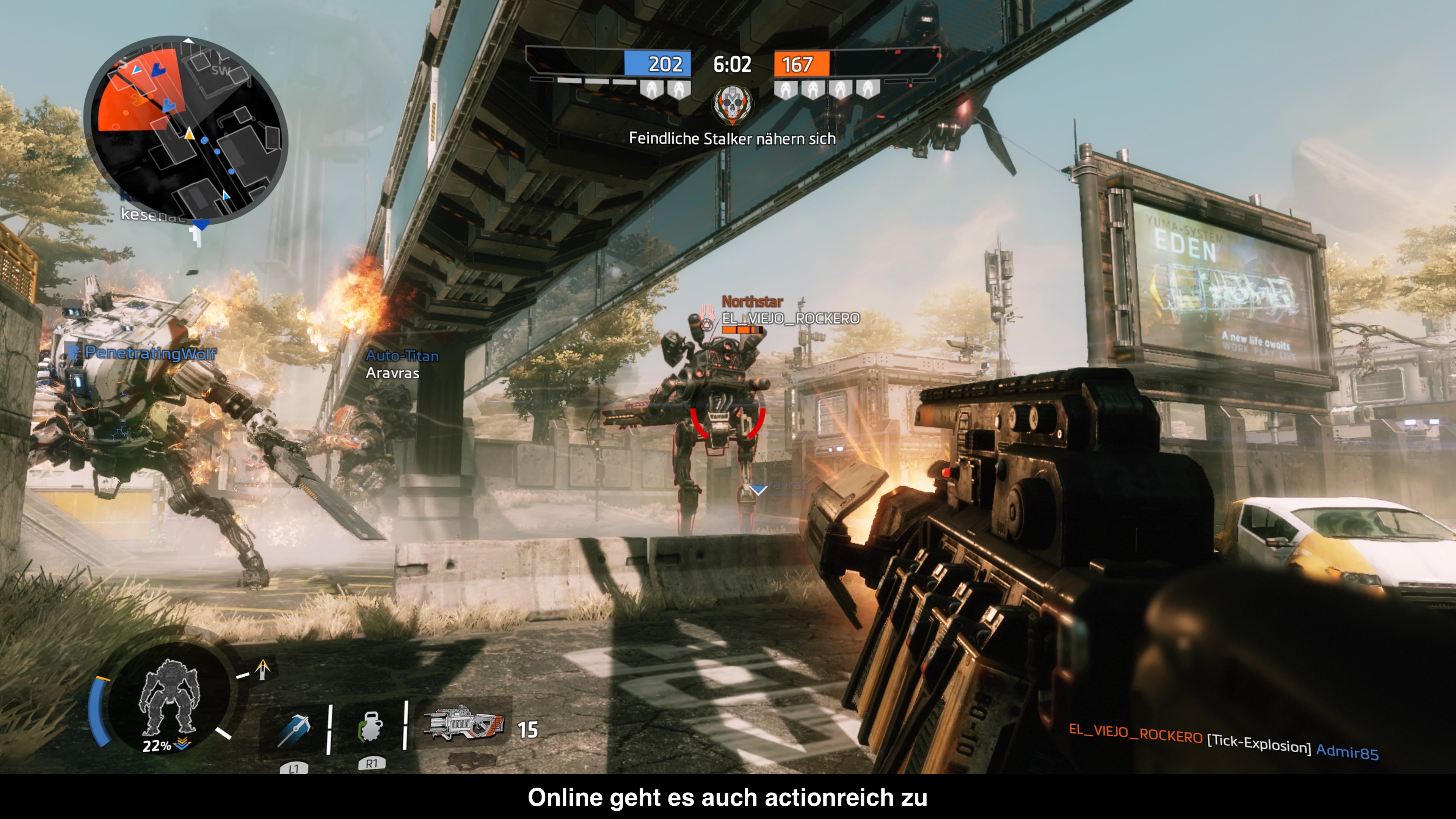 Natürlich gibt es neben der Kampagne auch noch einen umfangreichen Online-Modus. Hier stehen allerlei Spielmodi zur Verfügung, die man sonst auch aus anderen Online-Shootern kennt, die aber hier natürlich dank der Titans etwas mehr Abwechslung versprechen und Taktik erfordern. In den meisten Spielmodi ist der Titan eine Art Belohnung, wie der Killstreak bei Call of Duty und kann anschließend angefordert werden, um den Gegnern so richtig einzuheizen. Es gibt aber auch Spielmodi wie „Last Titan Standing“, in denen man sofort mit einem Titan beginnt und diesen auch nicht verlassen kann. Allgemein gesehen laufen die Online-Spiele wunderbar flüssig ab, ohne größere Lags und machen viel Spaß. Die hohe Beweglichkeit sorgt für einige lustige Spielsituationen, wobei manchmal etwas mehr Spieler auf den Maps wünschenswert werden. Das Maximum liegt bei 16 Spielern und manchmal wirken die Maps dadurch etwas leer. Zudem dauert das Matchmaking manchmal etwas sehr lange, aber immerhin führt das letztlich zu sehr sauberen Spielen.