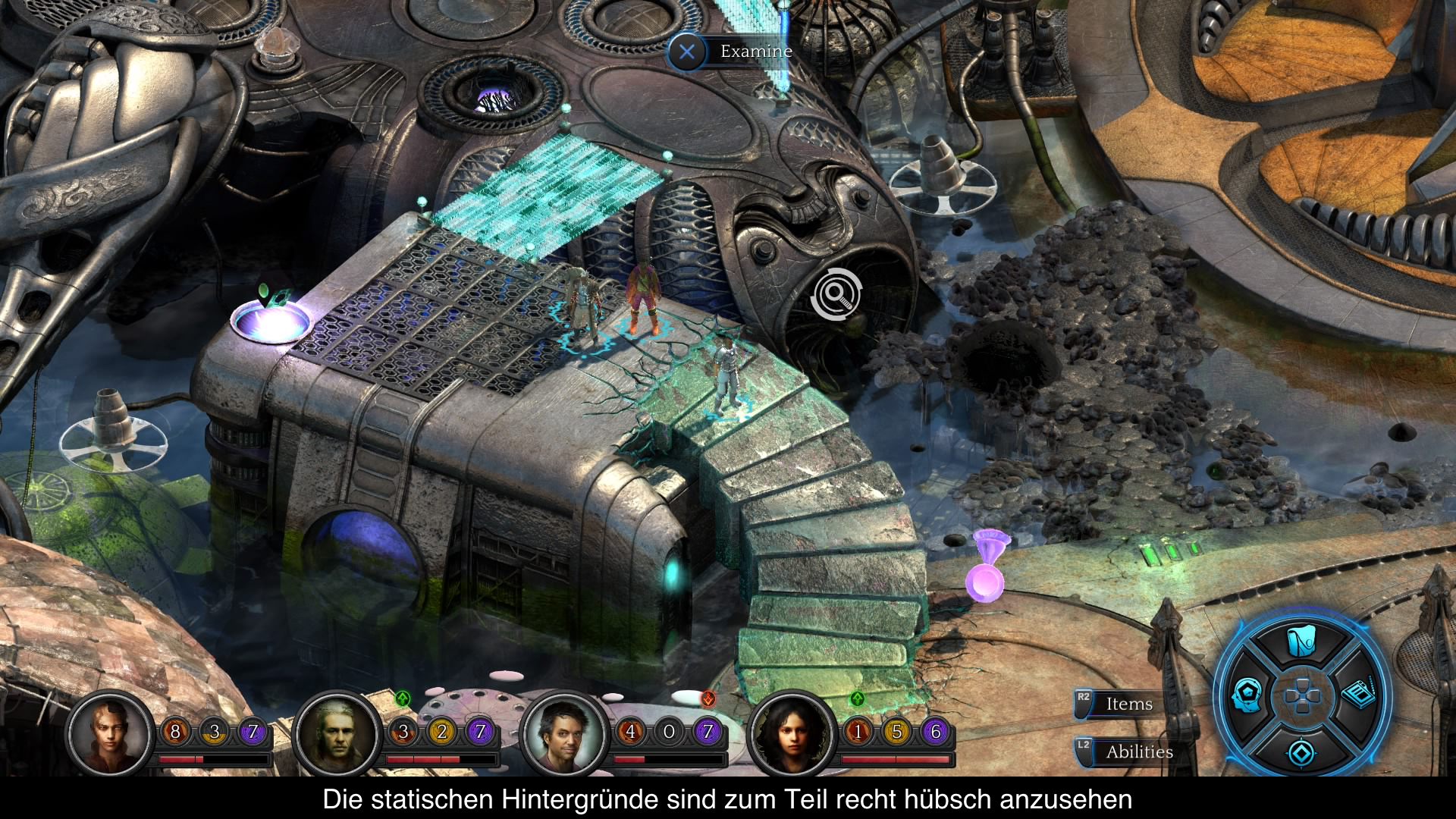 Im Gameplay wird an sich wenig Neues geboten: Ich laufe herum, rede mit sehr vielen Leuten, untersuche die komische Welt, probiere dies und das aus, erledige gut designte Quests, die auch gerne Hirnschmalz erfordern und lerne meine Mitstreiter kennen. Die größte Neuerung ist das Krisen-System, was im Prinzip den Kampf meint, aber vielschichtiger ist. In der Krise kann ich meine Recken nicht nur bewegen und zuschlagen bzw. Cypher benutzen lassen, sondern ich kann mit meinen Gegnern sprechen oder Objekte in der Umgebung zu meinem Vorteil nutzen. In einer Situation gleich am Anfang zum Beispiel kann ich mich entweder schon vor der Krise rausreden (sofern ich den Check bestehe) oder ich aktiviere in der Krise mittels meiner Ingenieurstalente ein paar schlafende Mechanismen, um mir einen Vorteil zu verschaffen.