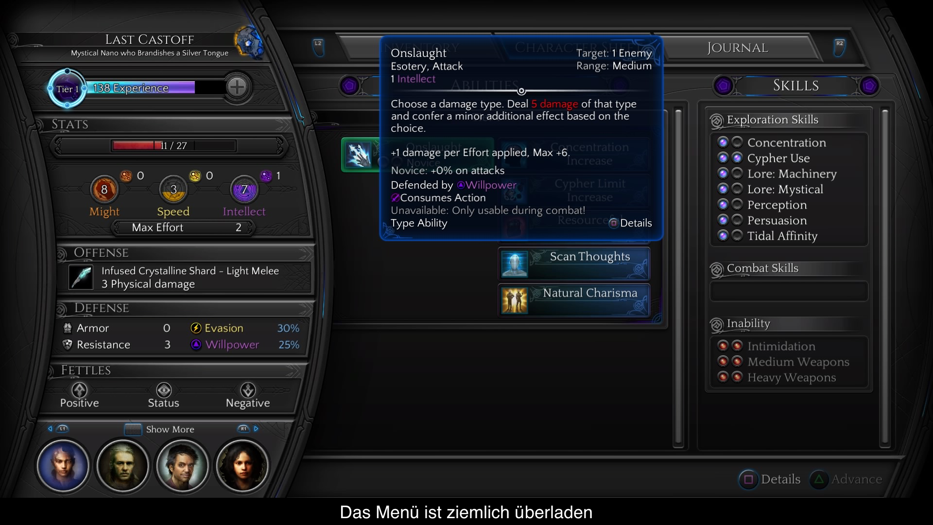 Die Regeln sind bewusst einfach gehalten, um das Geschehen in den Vordergrund zu stellen: Es gibt nur drei Klassen: Den Cypher-werfenden Nano, die kampfbetonte Gleve und den vielseitig einzusetzenden Jack. Anstatt vieler Attribute gibt es drei Pools (Kraft, Geschwindigkeit, Intellekt), die in Verbindung mit Fähigkeiten jeden Skill Check modifizieren. So wird sichergestellt, dass das Geschehen im Vordergrund steht und nicht die Regeln. Da sich „Torment: Tides of Numenera“ sehr bedeckt hält, was die Folgen des eigenen Handelns angeht, verleitet es mich dazu, wirklich den Charakter zu spielen, den ich spielen will und nicht ins Powergaming zu verfallen, um möglichst einfach durch das Spiel zu walzen.