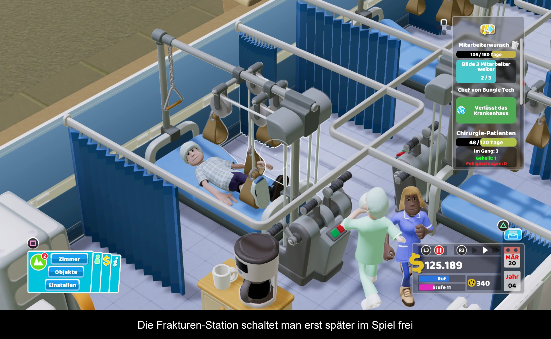 Grundlegend kann man die Steuerung als sehr gut gelungen bezeichnen. Der Controller ist nicht überbelegt und jede Taste hat seinen Zweck. Da man auf unnötige Doppelbelegungen verzichtet hat, wurde das Menü dementsprechend aufgebaut. Mit Viereck erscheint das Hauptmenü, in dem man Räume plant, sein Personal verwaltet und die Zufriedenheit der Patienten überprüft. Die Texte sind lesbar und die Sortierfunktion erfüllt ihren Zweck. Für das Personal klappt das gut, doch für Patienten und den Behandlungskosten muss man schon etwas scrollen. Hier verliert man schnell den Überblick. Auch bei der Raumplanung schlägt das System die richtige Größe und die notwendige Einrichtung vor. Ohne viele Klicks hat man seinen Behandlungsraum gebaut. Will man ihn im Detail dekorieren muss mit der Steuerung etwas kämpfen. Jedes Objekt braucht einen gewissen Platz und die Möglichkeit, dass es vom Personal erreicht wird. Hier hat das System Schwächen, da die Controller-Steuerung sehr „magnetisch“ ist und die Objekte sich nicht in beliebige Positionen bringen lassen. So kann man gewisse Räume nicht optimal ausnutzen.