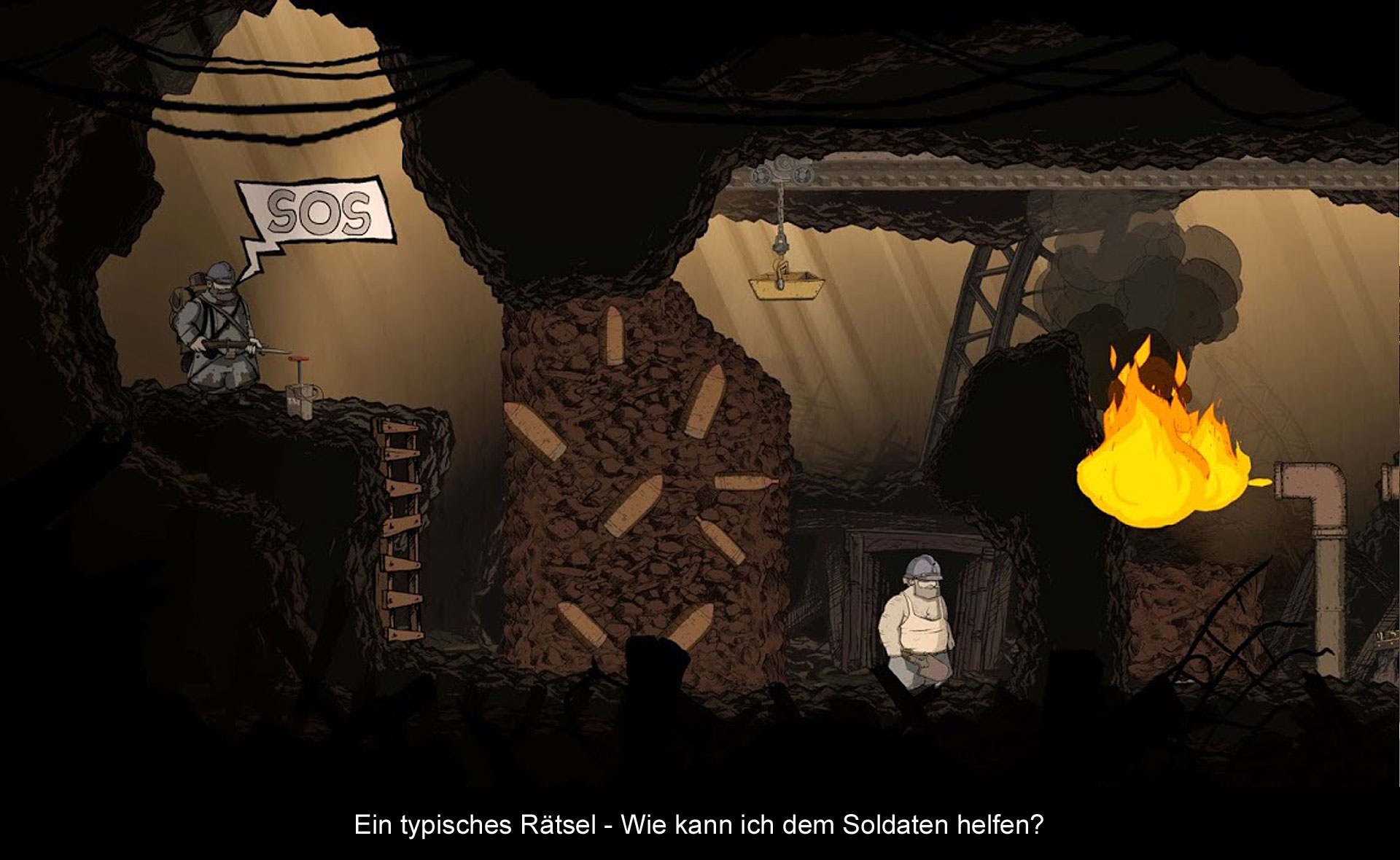 „Valiant Hearts: The Great War“ ist in vielerlei Hinsicht ein etwas anderes Kriegsspiel. Das Gameplay kommt größtenteils ohne Waffen aus. Hier und da ist es zwar notwendig einen Geschützturm zu bedienen, um feindliche Stellungen auszuheben, aber das war es auch schon. Im Vordergrund stehen hier Rätsel. Ein Großteil dieser befasst sich mit dem Suchen spezieller Objekte, welche in der Umgebung versteckt sind. So braucht Anna einen Schal, der auf einen Baum hängt. Um an Ihn heranzukommen, gilt es eine Säge zu organisieren usw. Die meisten dieser Aufgaben basieren auf einfachen Physik-Rätseln, doch hin und wieder stößt man auch auf klassische Logikrätsel, wo einmal der Durchfluss von Wasser umgelenkt wird, oder ein bestimmtes Bauteil geprägt werden muss. Diese sind aber eher selten. Einen weiteren Großteil der Aufgaben löst ihr mit eurem treuen Hundebegleiter, der versteckte Objekte ausgraben kann, Menschen aus unerreichbaren Gefahrenzonen zerrt, oder durch kleine Löcher passt. Die Mischung der Rätsel ist durchaus gelungen. Man trifft selten auf zwei hintereinander folgende gleiche „Kopfnüsse“. Auch die Präsentation ist immer unterschiedlich. So erscheint manches Rätsel plötzlich in einem ganz anderen Licht.