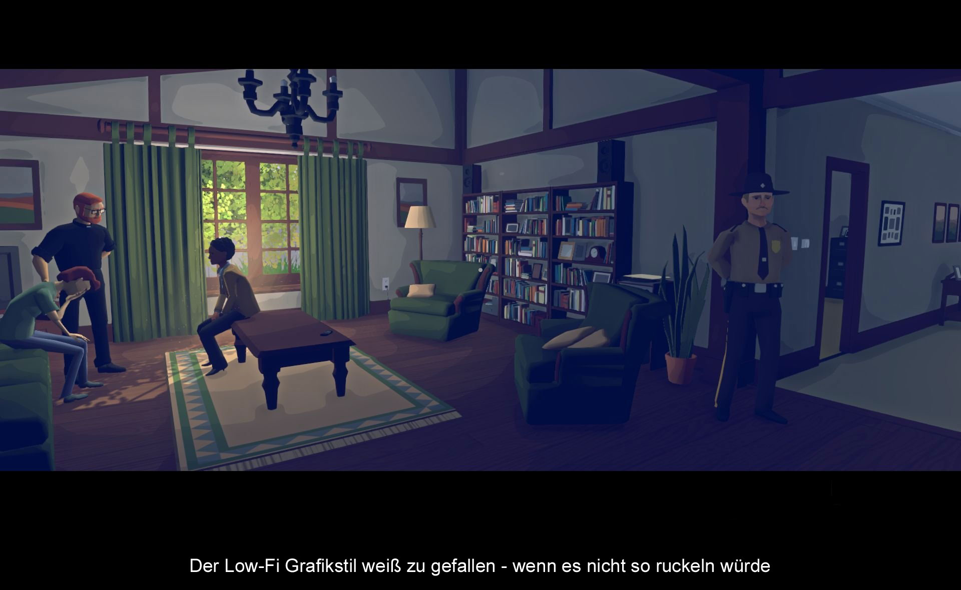 „Virginia“ ist ja ein Indie-Spiel, deshalb sollte man auch keine High-End Grafik erwarten. Insofern finde ich es auch gut, dass die Entwickler einen Stil gewählt haben, der zwar simpel – ja geradezu Lo-Fi ist, dennoch aber ausreichend Charme versprüht. Die Grafik wirkt wie aus einem Guss und durch das 21:9 Format kommt reichlich Film-Flair auf – und gerade dadurch will der Titel ja punkten. Weniger gelungen, ist dagegen die eigentliche Technik. Die Framerate kann nur als grottenschlecht bezeichnet werden und läuft bestenfalls im unteren zweistelligen Bereich, oftmals jedoch eher mit gefühlten 12 Bildern pro Sekunde. Das hat sogar bei mir Kopfschmerzen verursacht! Die abrupten Schnitte bzw. Übergänge verstärken das Gefühl zudem noch. Sprachausgabe gibt es übrigens keine, stattdessen wird das Spielerlebnis nur durch spärliche Soundeffekte und die passende Musik getragen. Gerade letztere kommt typischen Mystery-Filmen sehr nahe und passt sehr gut zu den verschiedenen Szenen. Für mich das Highlight im Spiel. Übrigens: Deutsche Übersetzungen von Zeitungsartikeln lassen sich optional einblenden, aber leider auf eine äußerst tumbe Weise (werden als große Kösten in das Bild projiziert). Ich hab das dann wieder abgestellt, da ich diese Art äußerst störend empfand.