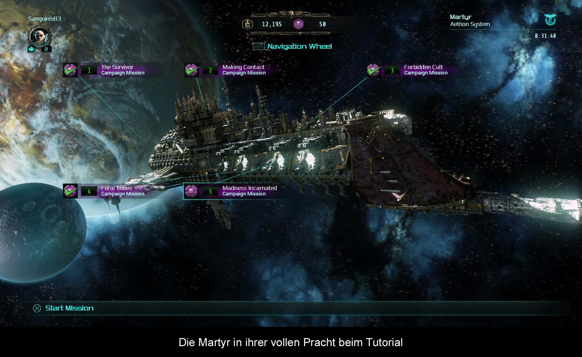 Nachdem ich also die ersten Decks der Martyr inspiziert habe, nimmt die Geschichte um die auf dem Schiff gefundenen Passagiere, u.a. einen Space Marine und einen weiteren Inquisitor, langsam Fahrt auf. Doch dann verschwindet die Martyr zunächst wieder und ich muss weiteres Personal auf diversen Planeten und Stationen des Sektors suchen. Dabei schaltet jede zusätzliche Personalie weitere Features frei. Der Space Marine von der Martyr zum Beispiel gewährt mir Zugriff auf den PVP-Modus, während der Tech-Priester mir neue Waffen und Ausrüstung herstellen kann. Auch der Coop- und Online-Modus muss so erst freigeschaltet werden.
