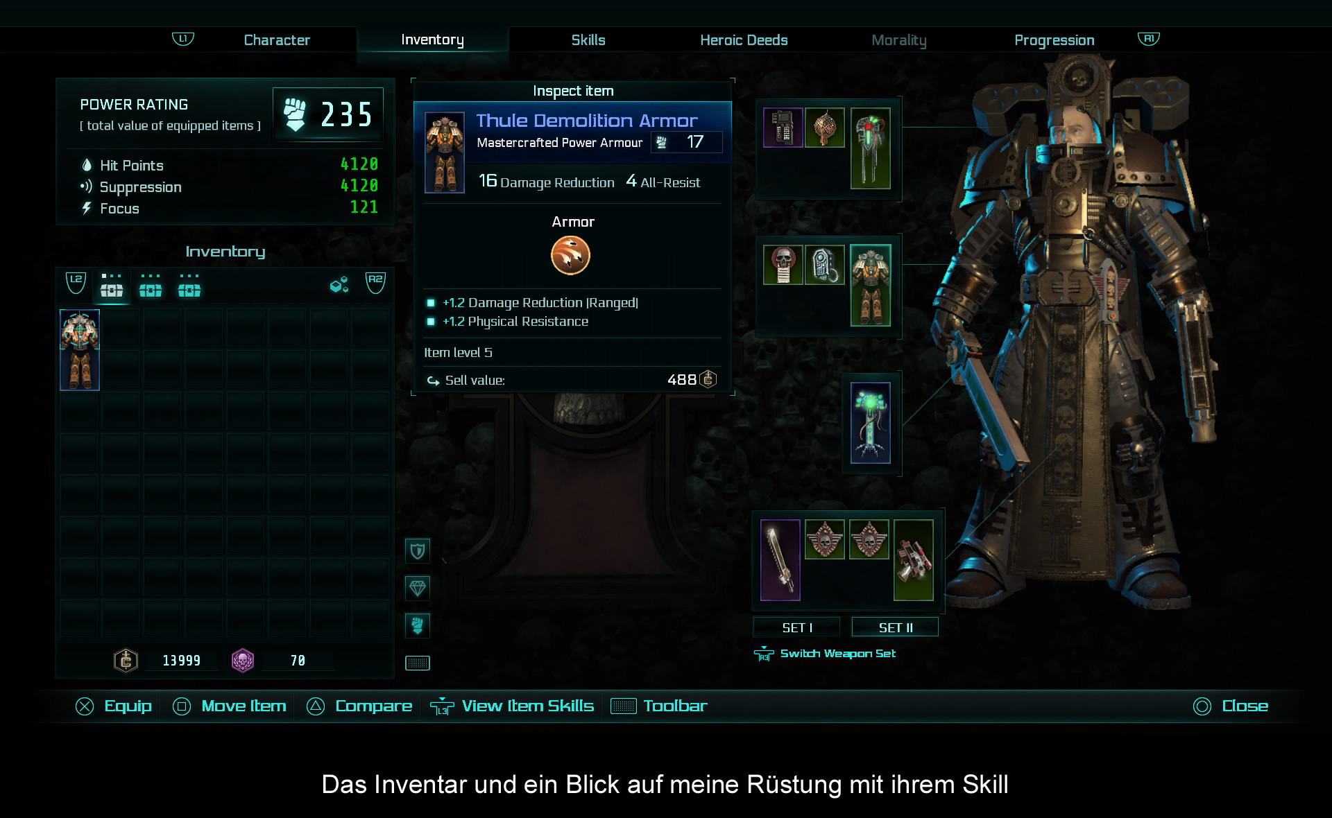 Ich spiele den namensgebenden Inquisitor des Imperiums, einen Agenten mit fast absoluter Macht, der sehr weitreichende Befugnisse und Freiheiten besitzt. Im Caligari-Sektor haben Warp-Stürme ein sehr altes Schiff, die „Martyr“, ausgespuckt, auf dem komische Dinge vor sich gehen und mächtige Artefakte zu finden sein sollen. Und ich werde dort hingeschickt, um die Sache zu untersuchen. Nach der unvermeidlichen Bruchlandung meines Landeshuttles wird der erste Ausflug auf die Martyr für das Tutorial benutzt. Hier fällt gleich auf, dass das Spiel es etwas anders machen möchte als Diablo & Co., um sich ein wenig abzuheben: Meine benutzbaren Skills sind nicht an meine Charakterklasse gebunden (von denen es drei Stück gibt: die Tank-Klasse heißt Crusader, der magisch begabte Psyker und der schleichende Schurke nennt sich Assassine), sondern an die von mir verwendete Ausrüstung. Waffen und Ausrüstung verfügen über ein bis vier Skills, die zur Waffe passende Wirkungen haben. So verfügt ein schwerer Bolter über eine immer schneller werdende Salve und auch über Granaten, ein Plasmagewehr hingegen über Einzelschüsse und einen konzentrierten Überladungsschuss. Ganz anders hingegen spielt sich der Psyker, der nur bedingt auf normale Ausrüstung setzt, sondern seine Psyker-Kräfte unabhängig entwickelt und einsetzen kann. Während ich bei normalen Waffen nur auf Munition und Überhitzung achten muss, darf der Psyker nicht zu achtlos mit seinen Kräften umgehen, da er sonst den Mächten des Warps (und damit des Chaos) ausgesetzt ist. Das ist eine schicke Mechanik, um die teils sehr mächtigen Sprüche zu balancieren.