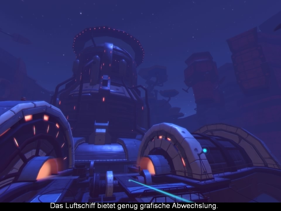 Das wundervolle an Wayward Sky ist allerdings die Präsentation. Die Grafik kommt mit schönen Pastellfarben daher und bietet einen extrem plastischen Look. Die Figuren glaubt man fast anfassen zu können und wirken wie kleine Actionfiguren. Auch die Festung an sich schaut gut aus und bietet in der Spielzeit optisch genug Abwechslung. Ein bisschen fühlt man sich auch an Animationsfilme wie z.B. “Laputa: Castle in the Sky” erinnert. Hinzu kommen teils riesige Roboter, welche schon mal mehrere Bildschirme groß und toll animiert sind. Zwar läuft das Geschehen (bis auf die Schalterrätsel) in der Third Person Perspektive ab, dennoch ist der VR Aspekt nicht nur aufgesetzt. So entdeckt man die Geheimnisse nur, wenn man mit dem Kopf um die Ecken oder vorbei an Hindernisse schaut. Auch unter Fußböden zwischen Rohrsystemen findet sich das ein oder andere Bauteil. Man ist also mit dem Kopf ständig in Bewegung, was das Mittendrin Gefühl noch mehr verstärkt und man sich ein bisschen wie in einem Diorama fühlt. Untermalt wird das Abenteuer durch einen stimmigen und bezaubernden Soundtrack und englischen Sprechern. Bei den Soundeffekten hätten aber mehr Umgebungsgeräusche dem Spiel gut getan. Eine deutsche Synchronisation sparte sich Uber Entertainment übrigens (Anm. d. Red.: Hey, das ist ein kleines Indie-Studio und kein riesiger Publisher! Die meisten Indie-Games sparen sich ja deutsche Untertitel! Das kann man bemeckern.) und man muss auf deutsche Untertitel zurückgreifen. Übrigens werden mit den Bauteilen Roboter für den im Hauptmenü stehenden Automaten freigeschaltet, wo euch ein simples Minispiel erwartet.