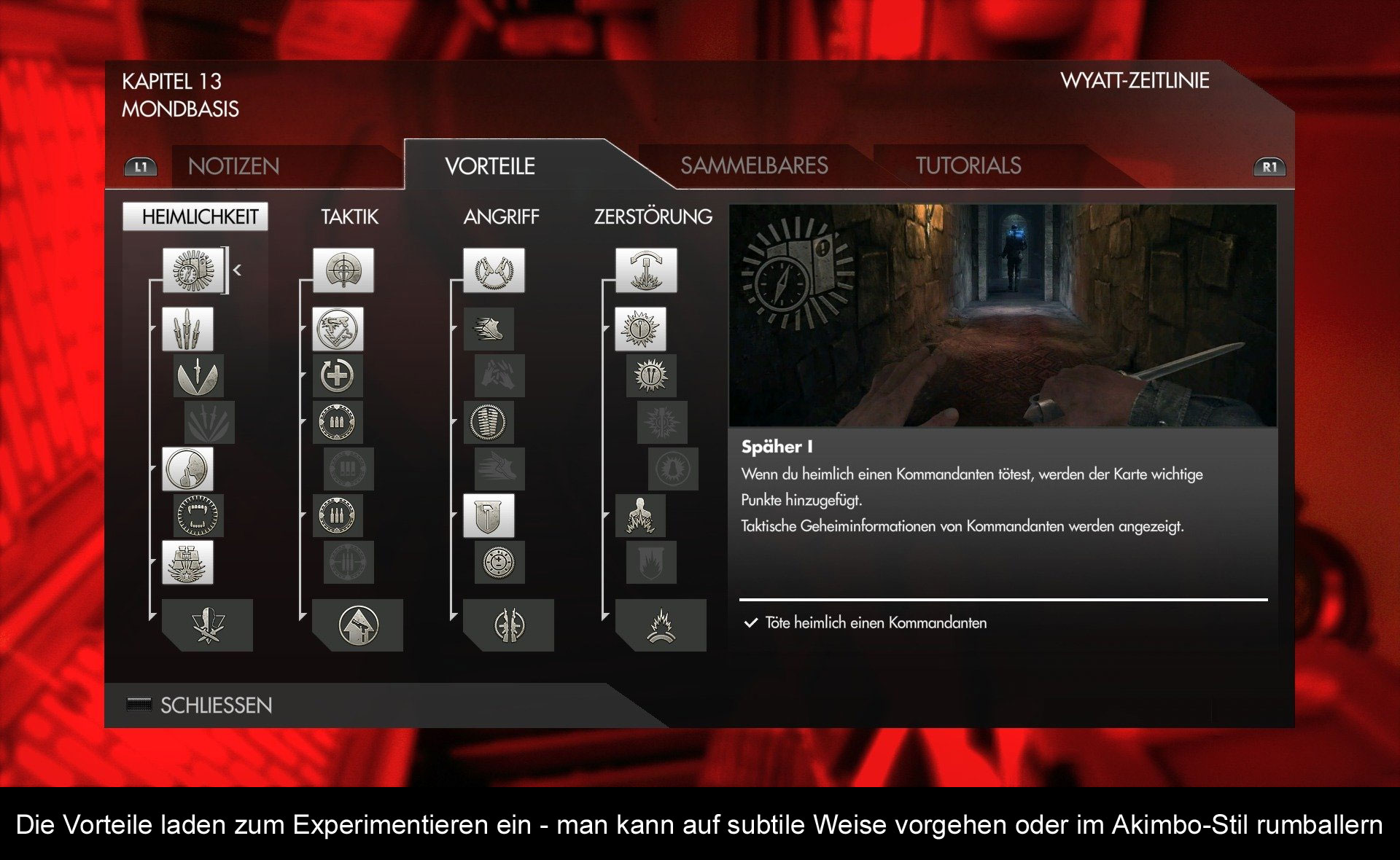 Was das Gameplay angeht, haben sich die Entwickler von Machine Games möglichst an das Original gehalten. Also etwas schnelleres Spielrinzip, viele Gegner, weitläufige Areale und viel zu Entdecken gibt es auch. Im Grunde ist es fast schon der komplette Gegensatz zu den aktuell erhältlichen Spielen und umso überraschender ist es, wie spaßig das Spiel doch ist. Das Töten der Nazis war noch nie so gut umgesetzt und die ganze Steuerung wirkt, wie aus einem Guss. Nach kurzer Zeit hat man sie verinnerlicht und kann sich ins Getümmel stürzen. Übrigens überlässt Wolfenstein: The New Order einem alleine, wie man das Spiel spielt. Wer möchte kann einen auf Rambo machen und kommt sogar gut voran. Für die etwas subtileren Spieler gibt es aber auch die Möglichkeit zu schleichen und sich völlig unbemerkt durch die Gegnerreihen zu kämpfen. Es ist zwar nicht immer einfach, aber umso zufriedenstellender, wenn man einen Bereich so gesäubert hat. Damit jeder das Spiel seinem eigenen Spielstil anpassen kann, gibt es auch noch Perks für bestimmte Taten im Spiel, wodurch man z.B. neue Fähigkeiten lernt oder sich im Schleichen etc. verbessert. Ebenfalls toll ist auch, dass die Level nicht nur schnöde Arenen zum Kampf sind, sondern auch viele Geheimnisse bereithalten. Wenn man also ein Areal von Gegnern befreit hat, wird man nicht direkt weitergeschickt, sondern kann in aller Ruhe das Gebiet absuchen. Neben Waffen und Munition gibt es aber auch einige Dokumente, welche die Geschichte während des Komas beleuchten oder aber andere verrückte Anspielungen und Collectibles. Teilweise kann man mit dem Suchen mehr Zeit verbringen, als mit dem eigentlichen Kampf und dadurch das alles freiwillig ist, sorgt dies für ein sehr angenehmes Pacing. Niemand wird gehetzt und jeder kann so spielen, wie er es möchte. Einen kleinen Wermutstropfen gibt es aber doch. Denn die Gegner-KI ist teilweise wirklich mehr als nur dumm und erkennt einen erst gar nicht, obwohl man vor dem Gegner steht und sorgt so für äußerst merkwürdige Momente. Zudem wird vor allem im letzten Drittel die Schwierigkeit ordentlich angezogen, was man durch teils unfaire Gegnerkonstellationen erreicht und so wurschtelt man sich von Raum zu Raum und hofft es irgendwie zu schaffen. Hier wäre etwas weniger mehr, aber immerhin entschädigen die interessanten Bosskämpfe dafür. Übrigens hat Wolfenstein: The New Order keinen Multiplayer-Modus. Für manche mag das ein Problem sein, jedoch wird dank des hohen Wiederspielwertes und einer tollen Kampagne auch so genug fürs Geld geboten.