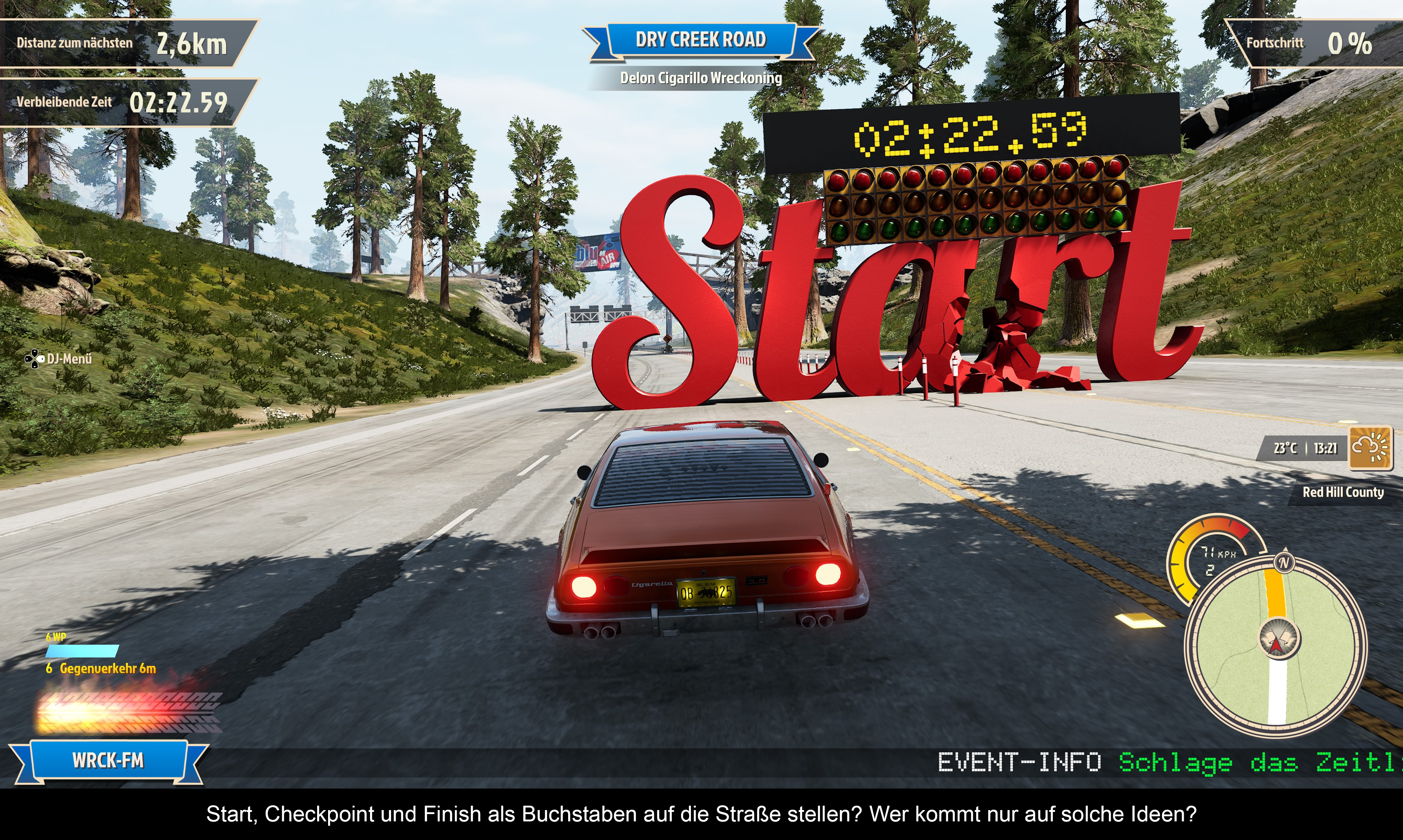 Um gleich mal eines vorwegzunehmen: Grafisch ist das Spiel keine Augenweide. Damit meine ich nicht nur die visuelle Gestaltung, sondern auch die Framerate mit vielen starken Ruckeleinlagen und Tearing. Die versprochenen 60 fps erreicht das Spiel nur, wenn man sich nicht in einem Rennen befindet und sich am besten auch sonst nicht bewegt. Da verwundert es umso mehr, dass die riesige Spielwelt (und ich meine wirklich riesig) so lieblos und austauschbar ausfällt. Es gibt kaum grafische Highlights, die zur Orientierung dienen. Alles wirkt irgendwie hingerotzt. Im Vergleich mit ähnlichen Open-World-Rennspielen wie „Forza Horizon“ oder „The Crew: Motorfest“ liegen Welten dazwischen! Es gibt auch ein paar andere nur schwer nachzuvollziehende Entscheidungen, wie die Schnappsidee, Checkpoints wortwörtlich als Buchstaben auf die Straße zu stellen. Wenn man mit 250 km/h durch brettert, sieht man nicht, was sich dahinter verbirgt, wie z. B. andere Verkehrsteilnehmer. Die unterschiedlichen Wettereffekte sind ganz nett, lenken aber auch vom Geschehen ab und erschweren durch den starken Blur-Effekt die Konzentration auf die Routenführung. Außerdem fahren sich die Autos bei Schnee und Eis noch bescheidener. Die Fantasy-Fahrzeugmodelle können sich dagegen sehen lassen und orientieren sich an realen Vorbildern. Eine Cockpit-Perspektive gibt es nicht (genauso wenig wie einen Fahrer) und auch eine Motorhauben-Ansicht sucht man vergebens. Man kann nur zwischen Stoßstange und Third-Person-Perspektive wählen. Wobei letztere Perspektive automatisch rauszoomt, wenn man Gas gibt. Ein paar zusätzliche Optionen wären nicht verkehrt gewesen. Die Crash-Verformungen sehen nicht besser aus als in „Burnout Paradise“. Richtig amateurhaft fallen dagegen die Pokale aus, die man nach einem Sieg gewinnt. Ähnlich wie bei der Menüführung, die im Grunde identisch mit der von „Burnout Paradise“ ist, wirkt das unfertig und billig. Was die Funktionalität betrifft. Nun ja, manche Dinge waren damals gut, zum Beispiel die Option, Einstellungen zu verändern, ohne das Spiel zu verlassen. Andere Dinge waren damals schon umständlich, weil man eben nicht alles mit einem Tastendruck lösen konnte.