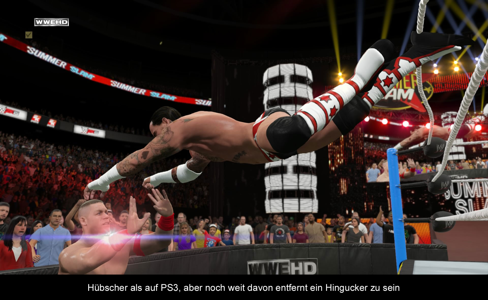 Grafisch hat WWE 2K15 auf der PS4 durchaus einen großen Schritt gemacht, was in Anbetracht der angestaubten Vorgänger auch kein großes Problem sein sollte. Leider ist der Schritt aber nicht riesig und kein Vergleich zum grandiosen grafischen Auftritt von NBA 2K15. So sind einige Charaktermodelle wirklich schön und lebensnah und andere wiederum sind hässlich und wirken eher wie High-Res Modelle des letzten Jahres. Das ist schon ziemlich schade, vor allem wenn dann auch die Animationen kaum angepasst wurden und weiterhin etwas steif daherkommen. Fragwürdig ist auch, dass beim Einzug der Wrestler schon im Ring stehende Wrestler einfach wieder verschwinden, weil der Einzug einfach nur ein Video ist. Immerhin gibt es weniger Clipping-Fehler als früher und das Spiel läuft auch stabil und kommt ohne Aliasing oder Tearing daher. Musikalisch hat 2k Sports auch etwas fragwürdige Entscheidungen getroffen. Da viele WWE-Stars im Einzug sich eher für rockige Songs entscheiden, könnte man auch einen entsprechenden Soundtrack erwarten. Dieser wirkt aber eher so, als ob jemand die Radio-Charts kopiert hätte. Statt Rock gibt es eher Pop und das passt teilweise gar nicht zu dem Spiel. Inakzeptabel ist auch die Tatsache, dass Wrestler im Kampf völlig ohne Sprache auskommen müssen. Keine Schreie, kein Schnaufen, nichts. Nur das Klatschen bei den Angriffen ist zu hören. Dafür wurden immerhin die Kommentatoren etwas verbessert, die nun ein paar mehr Phrasen auf Lager haben. Zu guter Letzt noch etwas zu den Ladezeiten. Diese sind wirklich unter aller Sau. Das man relativ lange vor einem Kampf warten muss, ist noch zu verkraften. Warum man aber bei fast jedem Klick in jedem Menü ewig warten muss, bis es weitergeht, wissen wohl nur die Entwickler. So verzichtet man schon freiwillig auf die Editierfunktionen im Karrieremodus oder sonst wo, da jeder Klick einen erstmal für mehrere Sekunden aus dem Spiel reißt. So wird selbst das simple Vergeben von Talentpunkten zur Tortur.
