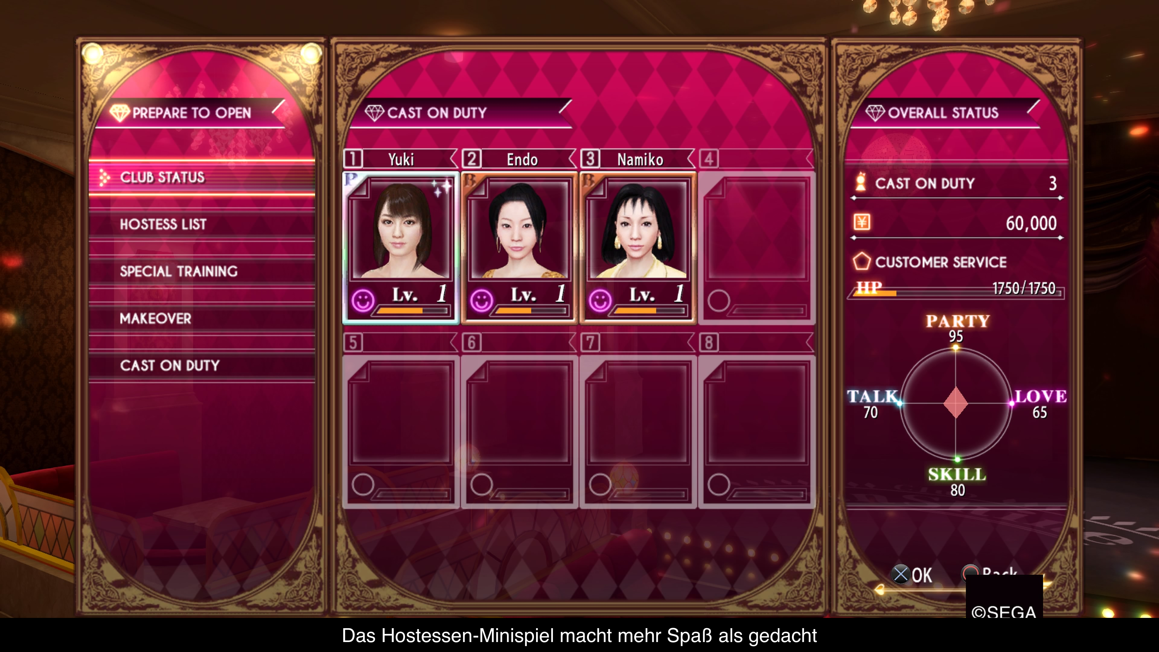 Yakuza 0 ist in mehrere Kapitel aufgeteilt, wovon jedes von einem der beiden Charaktere handelt und auch in zwei unterschiedlichen Stadtgebieten spielt. Es gibt nämlich Kamurocho mit Kiryu und Sotenbori mit Majima und beide Orte sind als offene Welt gestaltet. Man kann also durch die Straßen der Orte streifen, ein paar Läden besuchen und sich mit allerlei Zeugs die Zeit vertreiben, wenn man nicht gerade der Hauptgeschichte folgen möchte. Nur als Beispiel: Man kann Baseballabschläge üben, Poker, Billard oder Dart spielen, Frauen am Telefon zuhören, eine Immobilienfirma oder ein Cabaret führen und das ist nur ein Bruchteil der Möglichkeiten. Wer Lust hat, kann hier bestimmt über 100 Stunden investieren und dabei auf zum Teil sehr gut ausgearbeitete Minispiele zurückgreifen, die manchmal sogar kleinere Geschichten erzählen. Außerdem gibt es auch noch Sidequests, die man per Zufall auf offener Straße trifft. Mal hilft man hier einem Kind ein Spiel zu kaufen, dann muss man jemanden aus einer verrückten Sekte befreien oder den TV-Produzenten spielen. Leider gibt es die Möglichkeit, dass man die Sidequests einfach nicht mitbekommt, was bei der Fülle und Kreativität etwas Schade ist. Trotzdem machen all die Aufgaben Spaß und vor allem das Führen der Immobilienfirma und des Cabarets machen Spaß. Letzteres klingt vielleicht verrückt, aber plötzlich findet man sich vor dem TV und überlegt wie man seine Mädels am besten einkleidet, um beim entsprechenden Klientel am meisten Geld zu bekommen. Übrigens kann man manche der Minispiele sogar im Multiplayer lokal und online spielen und nach dem Durchspielen des Spiels gibt es noch einen Adventure-Modus, wo die Hauptgeschichte nicht stattfindet und man einfach so durch die Straßen streifen kann.