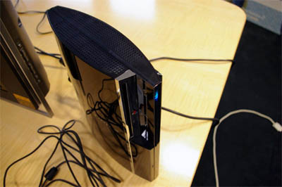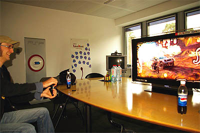 Aber gut jetzt mit dem ganzen Drumherum, kommen wir zu den Spielen! Auf der Fahrt hatten wir bereits mehr als genug Zeit zum Spekulieren gehabt. Was würden wir nun also für Games vorfinden? Neben den US Starttiteln malten wir uns aus, dass vielleicht Heavenly Sword, Eye of Judgement oder Warhawk dabei wären. Leider stehen aber gerade diese Titel nicht zur Auswahl – Schade. Im Schnelldurchlauf erklärt uns Stefan einige der vorhandenen Spiele: Resistance Fall of Man, Formel Eins, Motorstorm und Ridge Racer 7. Danach verschwindet er und überlässt uns ganz alleine die PS3. Nachdem wir kurz überlegen, wie wir die Konsole unbemerkt in unser Auto bekommen würden (und leider zu keiner Lösung kommen, da Überwachungskameras auf den Gängen und Kartenschlösser an den Türen, uns vor unlösbare Probleme stellen), wenden wir uns den Spielen zu. Die ausführlichen Eindrücke findet ihr weiter unten. Einzig zu Genji werdet ihr nichts lesen können, weil uns da ein kleines Missgeschick unterläuft und nun ja….lest einfach selbst…