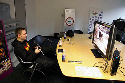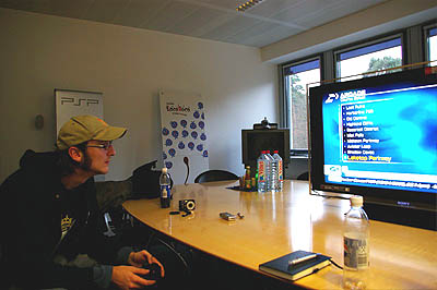 Da wären wir, in dem vor uns liegenden Bürokomplex ist irgendwo Sony Computer Entertainment Europa untergebracht. Aber wo? Gott sei dank, sind die Leute, die uns dort über den Weg laufen äußerst freundlich und weisen uns die Richtung. Nach ein paar Minuten im Foyer werden wir auch schon vom zuständigen PR Manager Stefan Dettmering begrüßt, welcher uns in einen speziellen Meeting Room in einer anderen Etage führt. Dort erwartet uns nicht nur die PS3 und ein paar Games, sondern auch ein riesiger Sony Bravia Full HD LCD TV (Shagy ist nicht mehr zu halten und der Sabber läuft ihm in Strömen die Kinnlade hinunter). Die Debug PlayStation 3 (Entwicklerversion, die auch unfertigen Code der Spiele auf gebrannten Blu-ray Discs abspielen kann) ist mittels HDMi Kabel an den Fernseher angeschlossen, aber es fehlt zum perfekten High-Definition Erlebnis noch ein ordentliches Soundsystem. Nach einem kurzen Gespräch mit Stefan über die Konsole im Allgemeinen (alle Anschlüsse und Ein-/Ausgänge werden erläutert), können wir endlich selber Hand an das Gerät anlegen. Dabei erstaunt es uns, dass die relativ große Konsole auch wirklich ziemlich schwer ist. Aber immerhin, für das Gewicht bekommt man im Gegenzug auch weit mehr Funktionen als bei der Konkurrenz geboten. Der "neue" Controller liegt übrigens richtig gut in der Hand und nur bei "Motorstorm" vermisst zumindest Shagy die Rumble Unterstützung. Dafür war der Sixaxis jedoch schön leicht, kabellos und die L2/R2 Tasten hatten herrliche Druckpunkte. Die Analogsticks sind jedoch nach wie vor etwas unpräzise und trüben zumindest bei Resistance den ansonsten guten Eindruck. Aber genug geschwafelt, Stefan startet nun endlich die (richtig leise) PS3, um uns ein wenig mit dem internen Menü vertraut zu machen. Kenner der PSP werden sofort zurechtkommen, aber auch alle anderen sollten mit dem einfach zu bedienenden Menü keine Probleme haben. Da es sich jedoch bei der vorliegenden PS3 Konsole, wie gesagt, um eine Debug Einheit handelt, sind nicht alle Funktionen (Filmwiedergabe und Onlineanbindung) verfügbar.